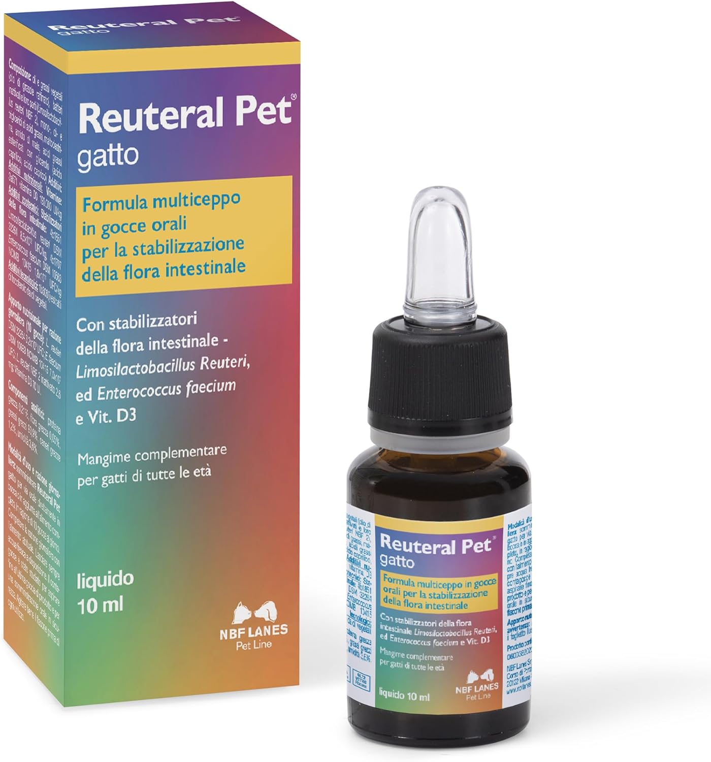Formula multiceppo in gocce orali per la stabilizzazione della flora intestinale.Mangime complementare per gatti di tutte le età con stabilizzatori della flora intestinale – Limosilactobacillus Reuteri, ed Enterococcus faecium e Vit. D3