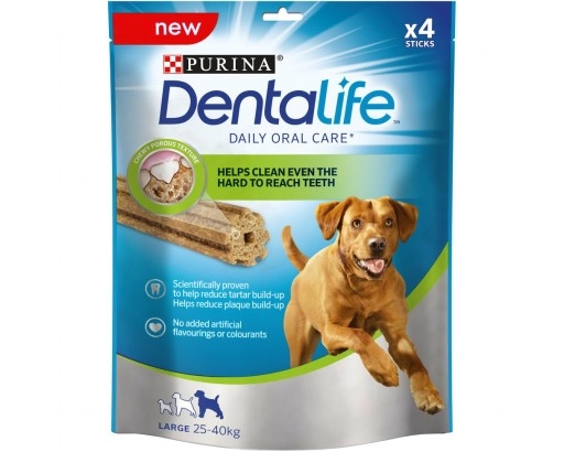 Purina Dentalife è l' innovativo snack da masticare specifico per l' igiene dentale dei cani. La salute dei denti del cane è fondamentale ed è pertanto importante mantenere un buon livello di igiene orale. Gli stick Dentalife di Purina, grazie alla loro consistenza morbida e porosa, puliscono anche i denti più difficili da raggiungere, come i molari che sono i più esposti alla formazione di placca e tartaro. È scientificamente provato che aiutano a ridurre la placca e il tartaro e a contrastare nuove formazioni. Grazie alla loro ricetta a ridotto contenuto di grassi, senza zucchero e priva di aromi e coloranti artificiali gli snack dentali Purina Dentalife sono indicati per l' uso quotidiano, favorendo così un' igiene orale continuativa.