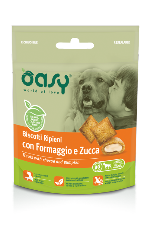 Vuoi avere altre info su Oasy Snack Biscotti Ripieni Con Formaggio e Zucca per Cani 80 g?