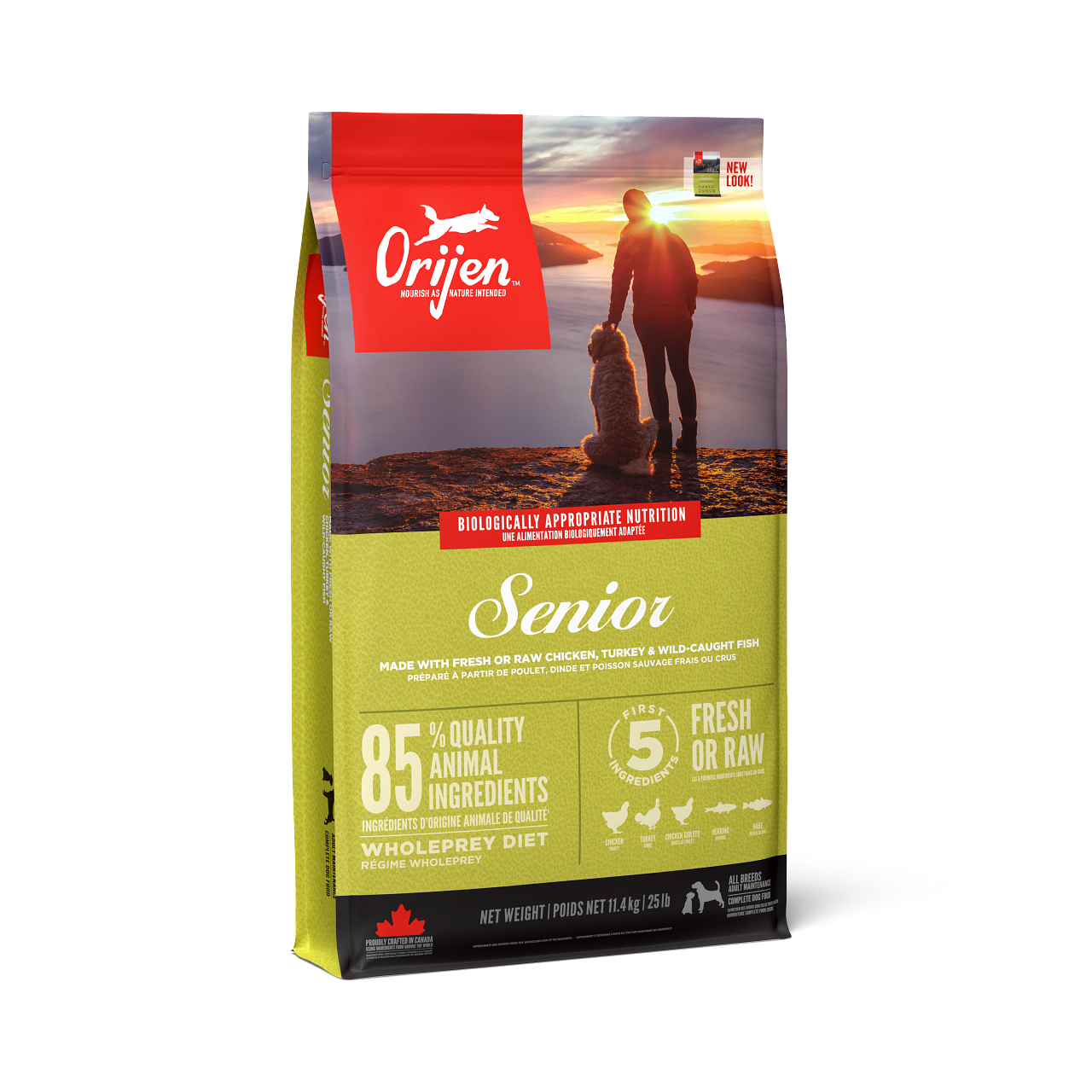 Prodotte da un' azienda a conduzione familiare di Alberta (Canada), le crocchette per cani Orijen Senior sono costituite solo da ingredienti locali freschi e selezionati.