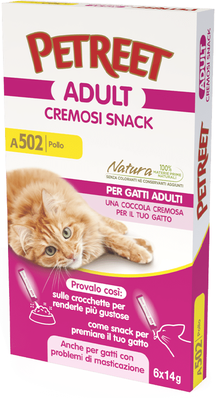 Lo snack per gatti Petreet e un delizioso spuntino cremoso realizzato con pregiato cane di pollo o di tonno accompagnati da verdura, come carote e piselli. Ideale come spuntino fuori pasto o sull' alimento principale per renderlo più appetibile è creato appositamente per deliziare anche i palati dei gatti più esigenti. La sua consistenza cremosa si adatta anche ai gatti con problemi di masticazione. I cremosi di Petreet sono creati senza l' utilizzo di coloranti e conservanti e con materie prime 100% naturali.