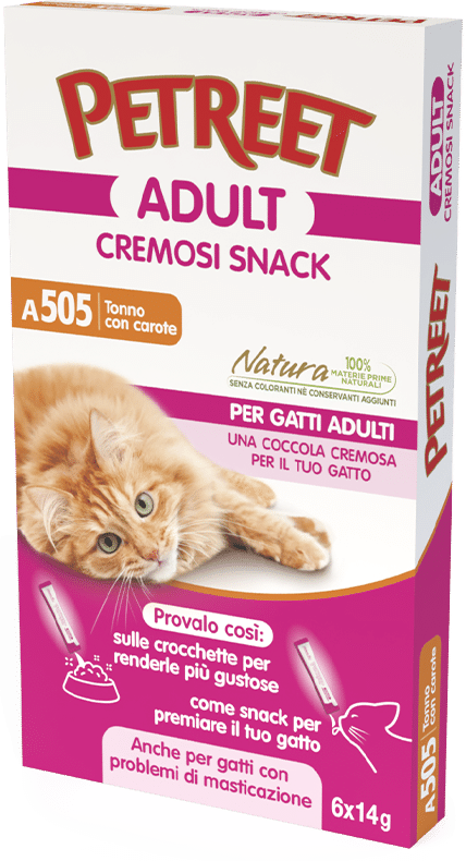 Lo snack per gatti Petreet e un delizioso spuntino cremoso realizzato con pregiato cane di pollo o di tonno accompagnati da verdura, come carote e piselli. Ideale come spuntino fuori pasto o sull' alimento principale per renderlo più appetibile è creato appositamente per deliziare anche i palati dei gatti più esigenti. La sua consistenza cremosa si adatta anche ai gatti con problemi di masticazione. I cremosi di Petreet sono creati senza l' utilizzo di coloranti e conservanti e con materie prime 100% naturali.