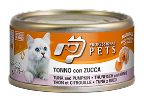 CIBO UMIDO IN SCATOLA PER GATTI tonno 65%, zucca 10%, acqua di cottura 24%, riso 1%.