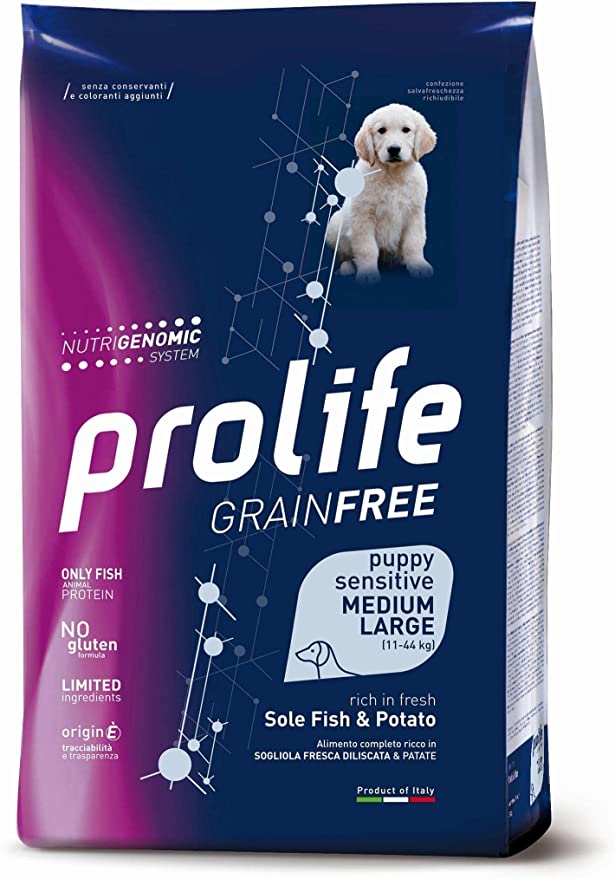 Sogliola fresca diliscata* 32%, Patate 27%, Pesce disidratato 10,6%, Grasso di pollo, Tapioca, Polpa di barbabietola, Proteina di patata, Alltech Nutrigenomic System Puppy 2%, Proteine idrolizzate di pesce, Polvere di carruba, Sostanze minerali, Inulina di cicoria - fonte di FOS - 0,1%, Glucosamina 0,037%, Solfato di condroitina 0,026%.