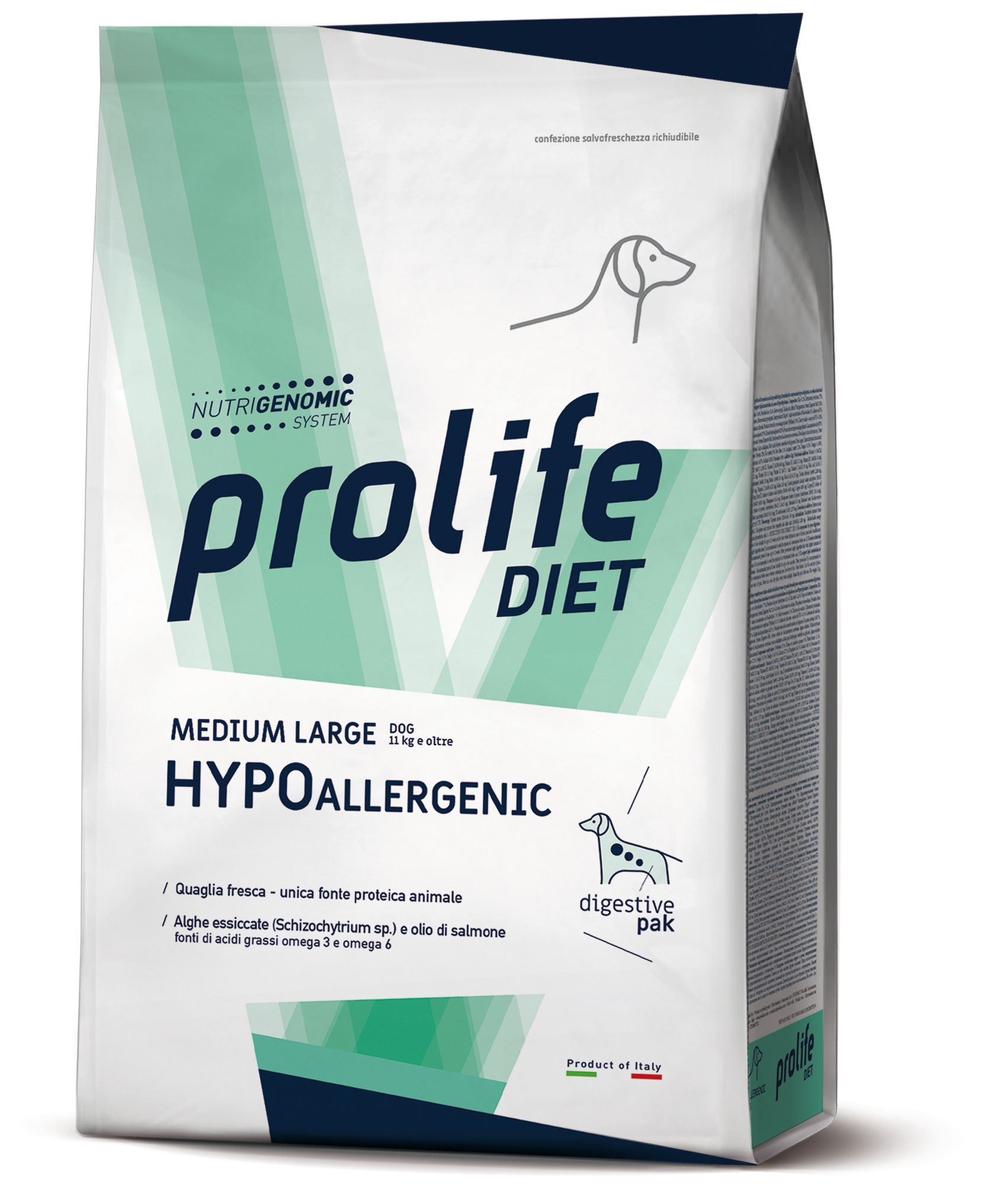 Alimento completo dietetico per il cane adulto di taglia media e grande formulato per la riduzione di intolleranze a ingredienti e sostanze nutritive.
