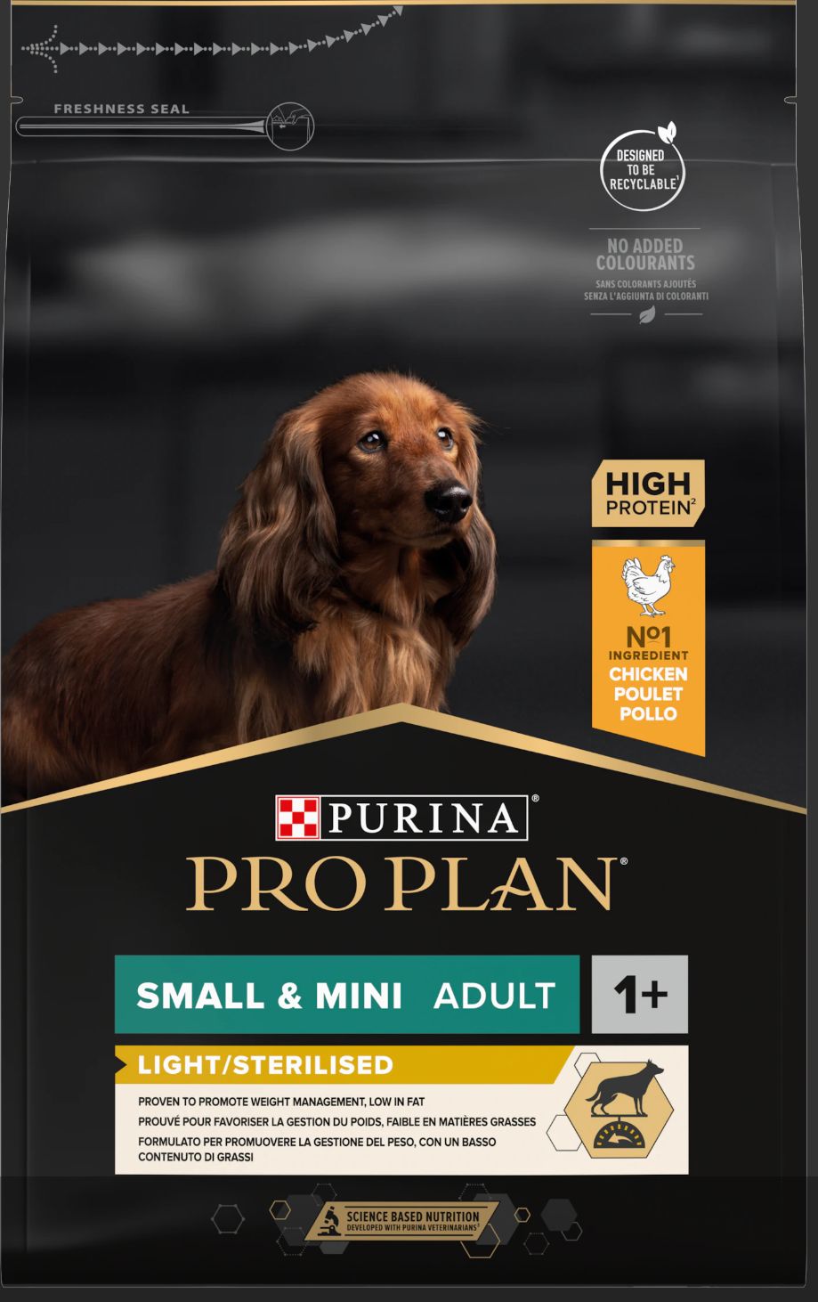 PURINA PRO PLAN SMALL & MINI ADULT LIGHT / STERILISED RICCO IN POLLO è un alimento completo per cani adulti di taglia piccola e mini in