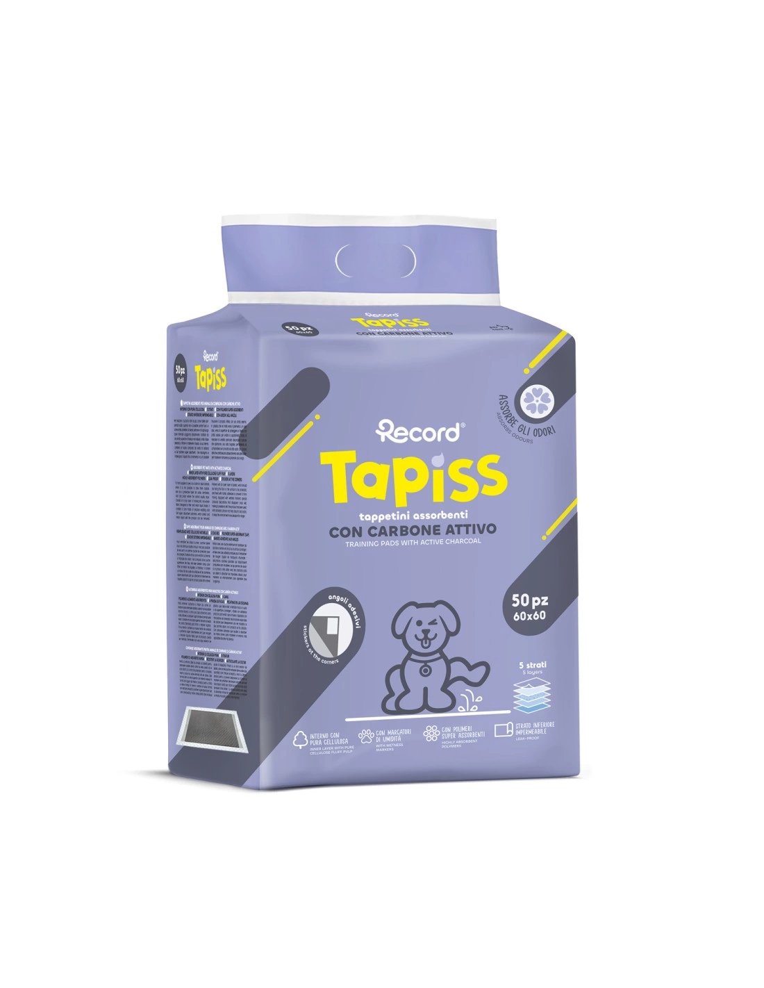 Tappetino igienico per cani Tapiss ai carboni attivi è la soluzione ideale per garantire pulizia e comfort in ogni ambiente. Progettato con materiali di alta qualità, combina funzionalità e resistenza con la sua struttura interna in morbida cellulosa arricchita da polimeri ultra assorbenti, cattura e trattiene i liquidi in modo efficace. Sottile e resistente con uno strato inferiore impermeabile protegge pavimenti e superfici da eventuali perdite. Inoltre è dotato di adesivi antiscivolo agli angoli, che garantiscono stabilità anche su superfici lisce, per una maggiore sicurezza e comodità. Un accessorio versatile perfetto per ambienti domestici, cliniche veterinarie e pensioni per animali. 1 ConfezionI da 50 tappetini.