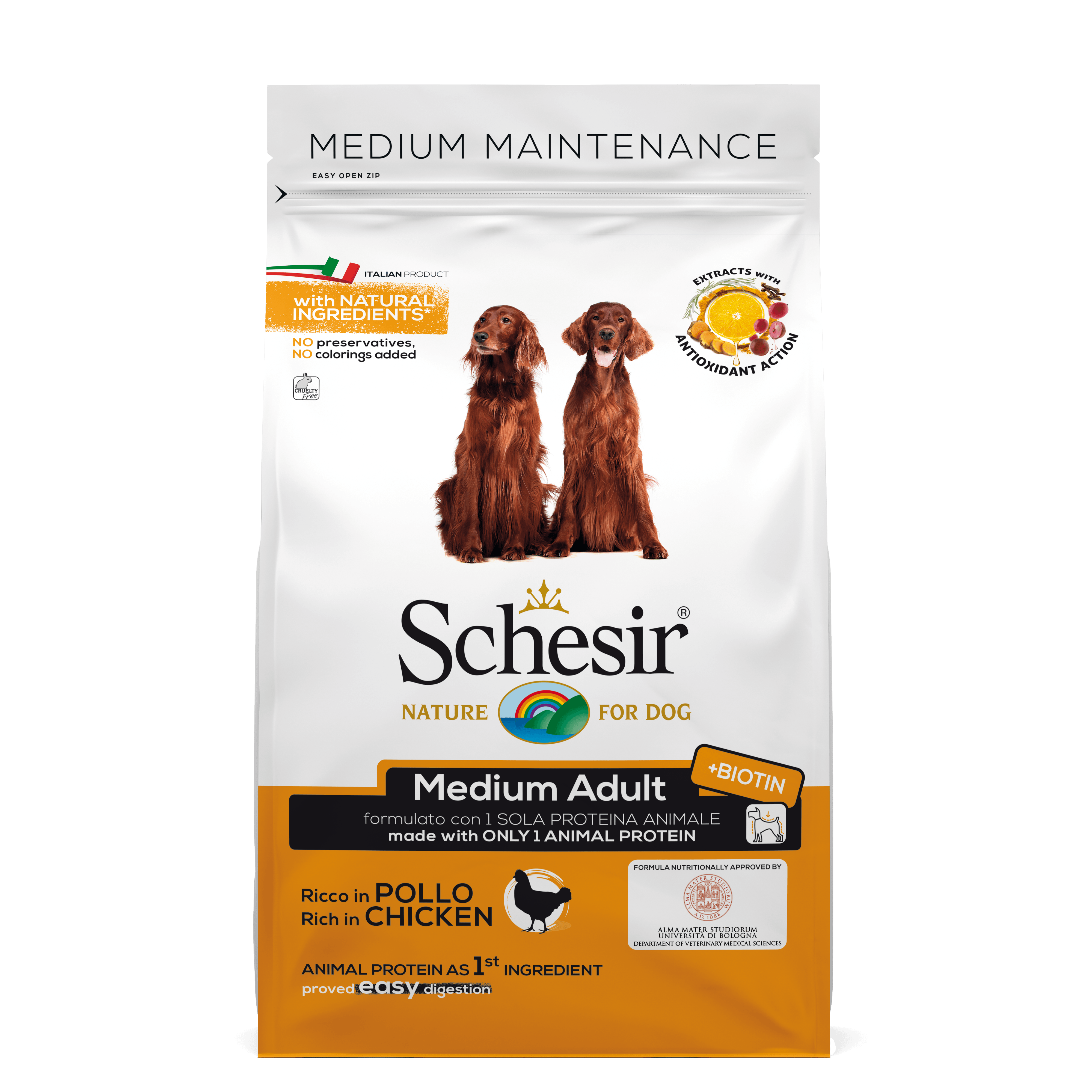 La gamma di crocchette SCHESIR DRY LINE è formulata con un'unica fonte di proteine animali ed è ricca di ingredienti naturali*, con aggiunta di vitamine e minerali, per rispondere alle esigenze nutrizionali dei cani adulti di taglia media, nelle varie fasi di vita e per aiutarli a mantenere ottimali condizioni di benessere.