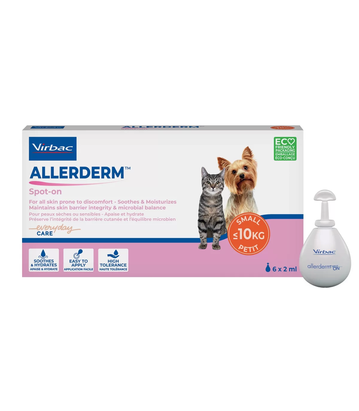 Virbac allerderm spot on 2 ml 6 pipette meno 10 kg è un' emulsione appositamente studiata per soddisfare le esigenze di cani e gatti con alterazioni della barriera cutanea.