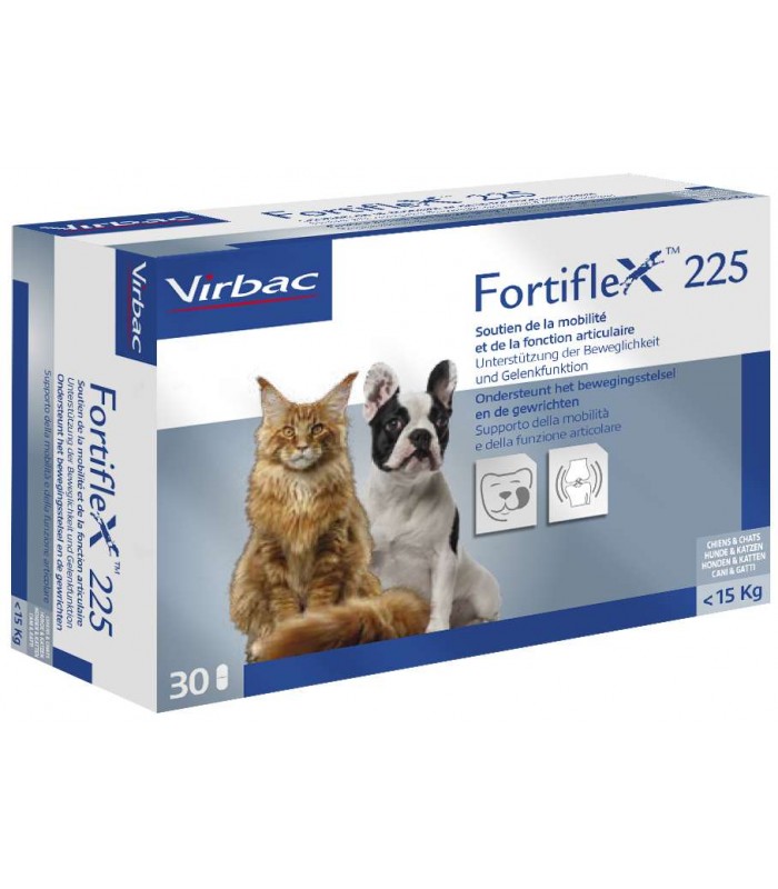 Virbac fortiflex 225 mg 30 compresse ? un supplemento nutrizionale appetibile e condroprotettore per cani e gatti. Ricco di elementi essenziali per la composizione della cartilagine ed utili per ristabilire la funzione locomotoria.