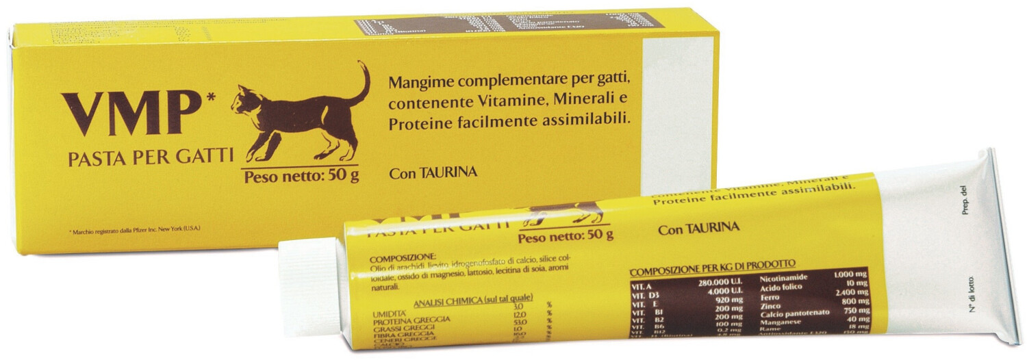 Modalit? d' usoVMP-Pasta ? ben accetto, e pu? essere miscelato con il cibo. Non riscaldare o cuocere per non alterare le vitamine. Somministrare 2 cm di pasta per kg di peso vivo (in pratica 1/2 cucchiaini da th? per 2 kg di peso).